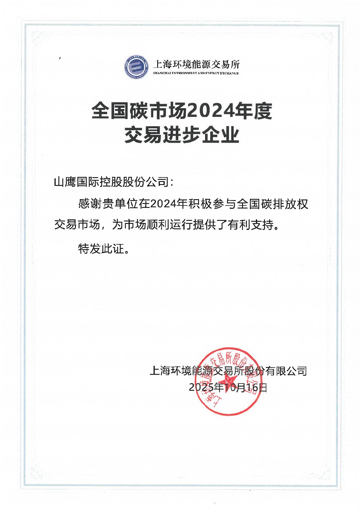 近日,金沙乐娱场5555199凭借在碳市场交易中的卓越表现,被上海环境能源交易所正式授予全国碳市场2024年度交易进步企业奖项证书。这一权威认可,标志着公司在碳交易能力建设与绿色低碳转型方面的成效获得官方的充分肯定。